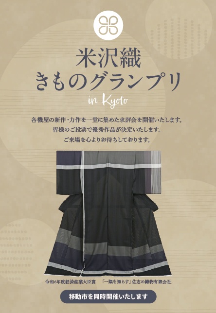 恒例の「米沢織きものグランプリ in Kyoto」を下記のとおり開催いたします。米沢産地の各機屋の新作・力作が並ぶ、見ごたえのある会となっております。移動市も同時開催いたします。